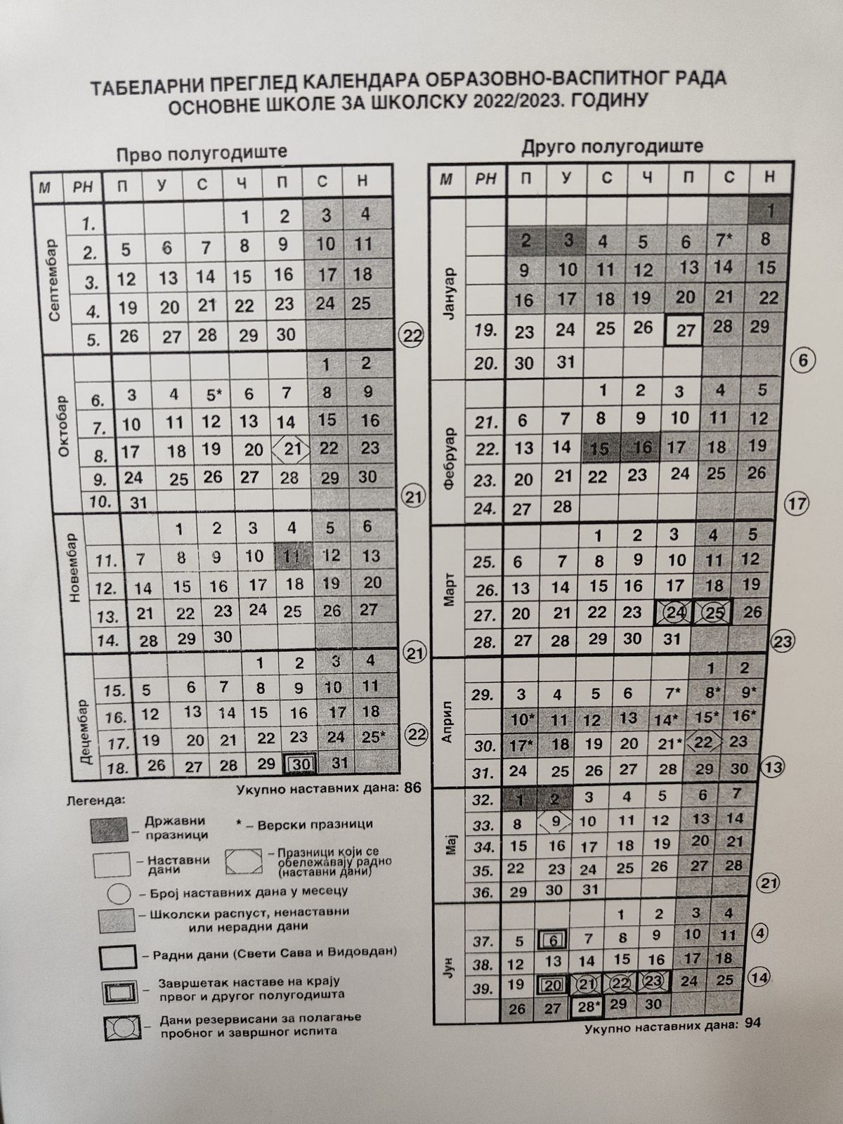 ШКОЛСКИ КАЛЕНДАР ЗА 2022/2023.